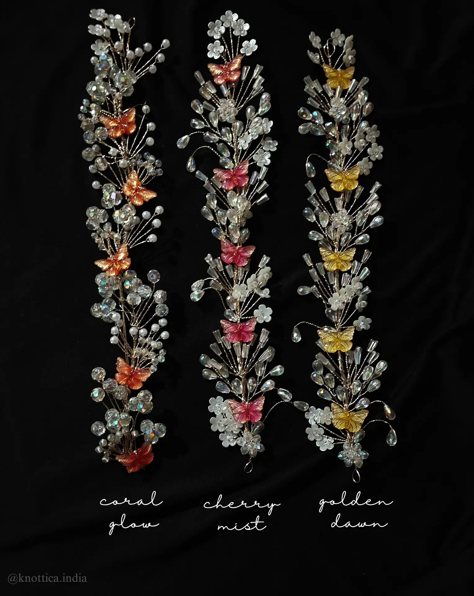 Step into a storybook moment with the Bloomie Hair Tiara – a dreamy cascade of shimmering crystal sprays, translucent florals, and fluttering butterflies in vibrant hues. Available in Coral Glow (orange), Cherry Mist (pink), and Golden Dawn (yellow), each piece is handcrafted to elevate bridal buns, braids, or open curls.