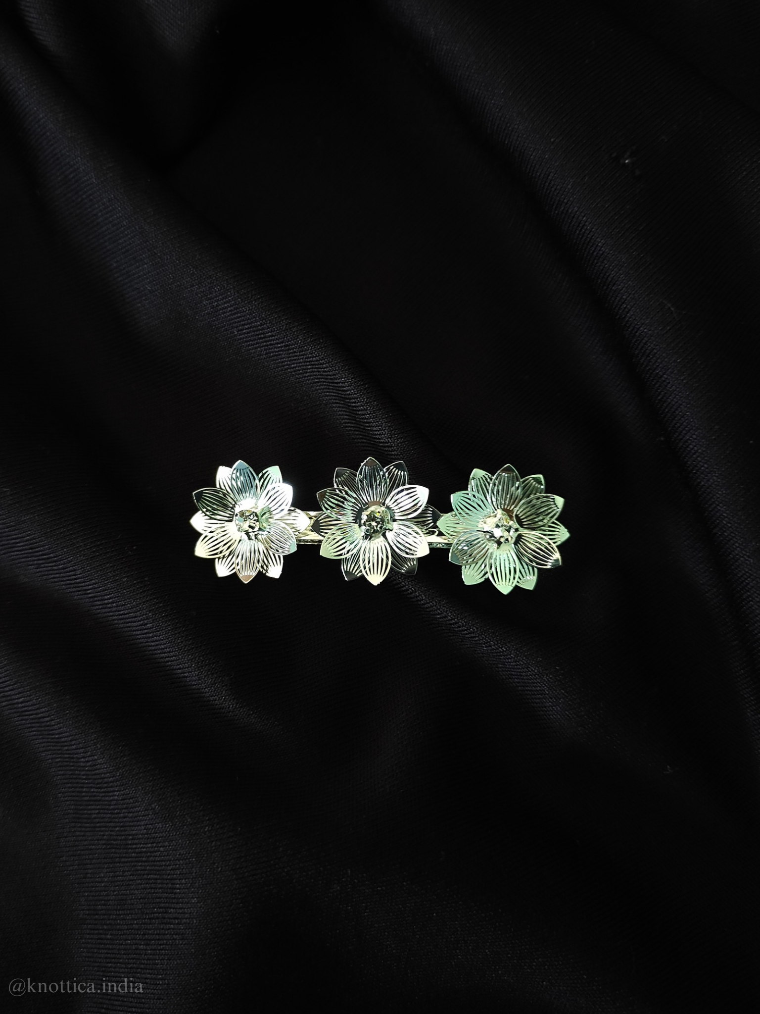 Inspired by moonlit lotus blooms, the Chaand Kamal Barrette captures a quiet opulence that speaks volumes. With intricately sculpted metallic petals and a subtle shimmer, this hair clip brings celestial beauty to your everyday moments.