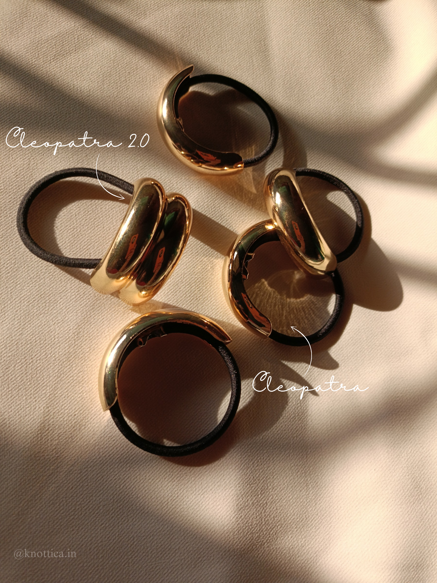 The Cleopatra Hair Cuff is a sculptural standout that redefines the everyday ponytail. Designed with twin high-shine golden domes and a sleek black elastic, this piece balances modern sophistication with minimal effort.