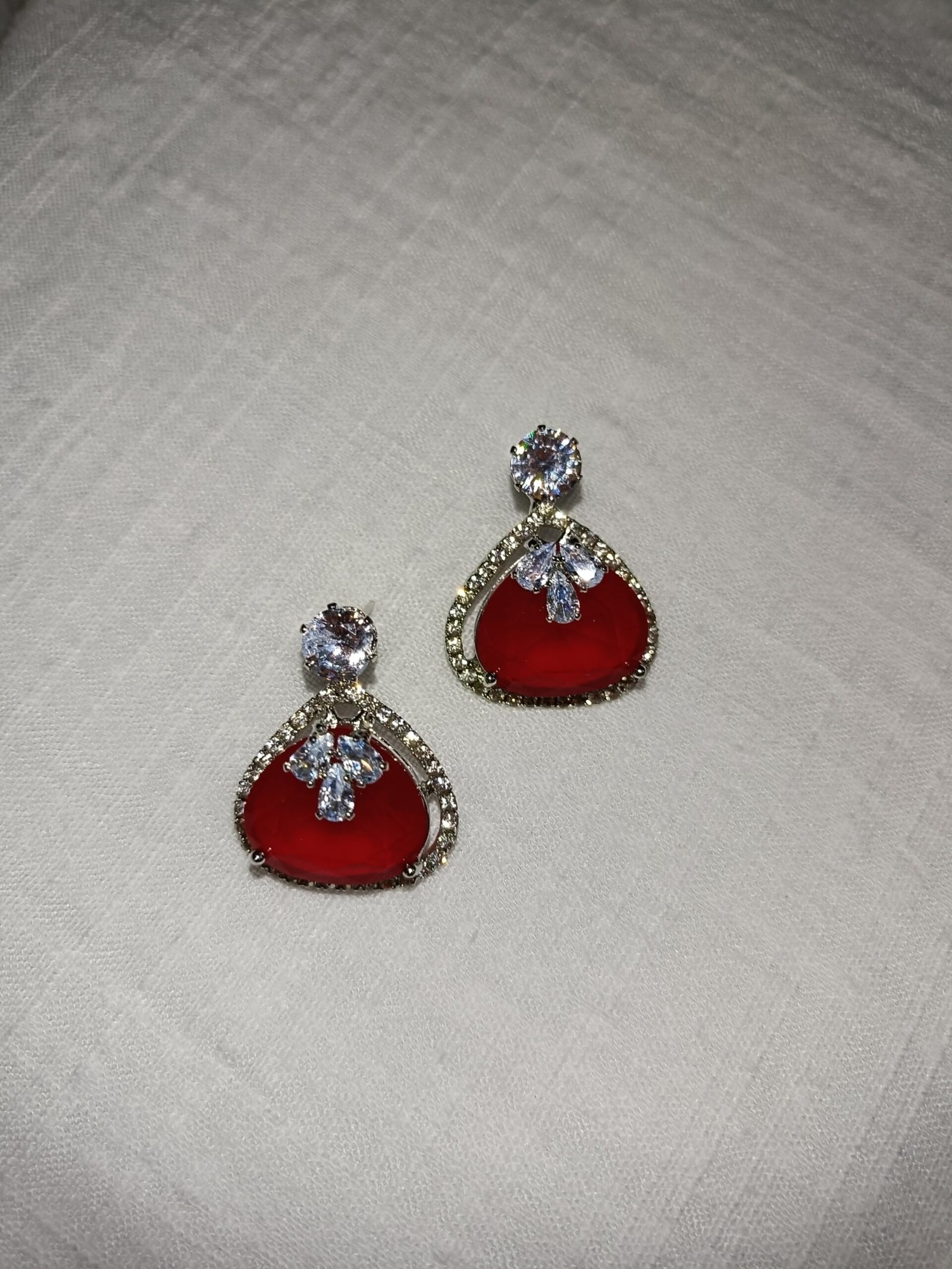 Elegant statement earrings available in six dazzling jewel tones—ruby, emerald, amethyst, green onyx, pink sapphire, and blue sapphire—framed with sparkling artificial diamonds for a radiant finish.