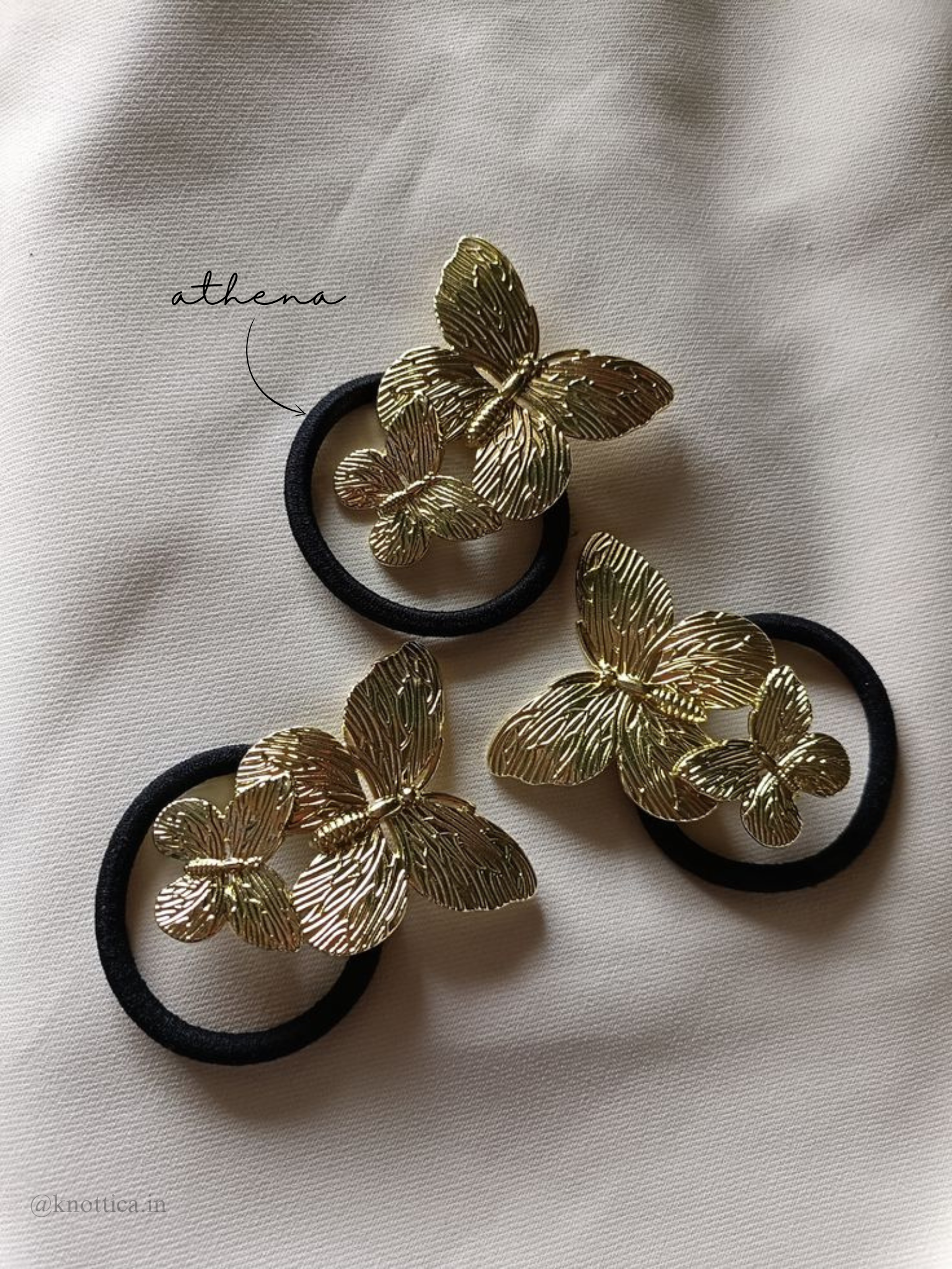 Elevate your everyday look with a touch of opulence. Our Athena Butterfly Hair Cuffs blend sophistication and charm with their intricately textured metallic butterfly motifs. Crafted to captivate, these elegant accessories feature a duo of gleaming butterflies in radiant gold, perched gracefully on a sleek black elastic, perfect for ponytails, buns, or wrist wear as a statement piece.