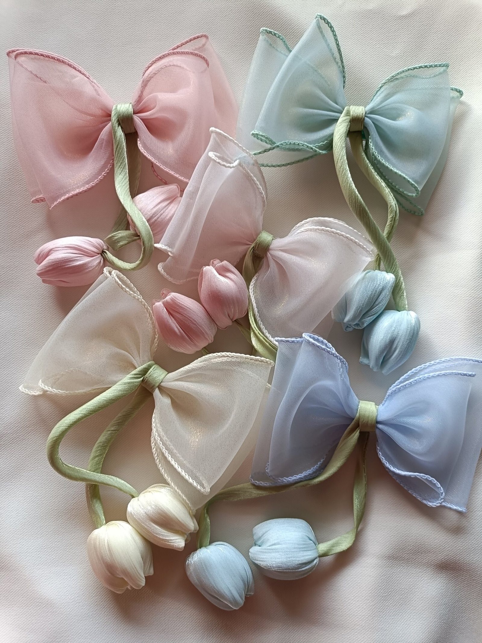 The Tulip Bow Clip is a delicate hair adornment inspired by nature’s softest gestures. Crafted with sheer pastel bows and soft crepe organza finished tulip buds, this piece brings a fairytale charm to your everyday look.
